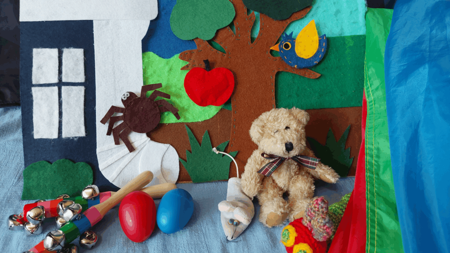 különféle szemléltető eszközökkel, csörgőkkel, kendőkkel, ejtőernyős játékkal kötjük